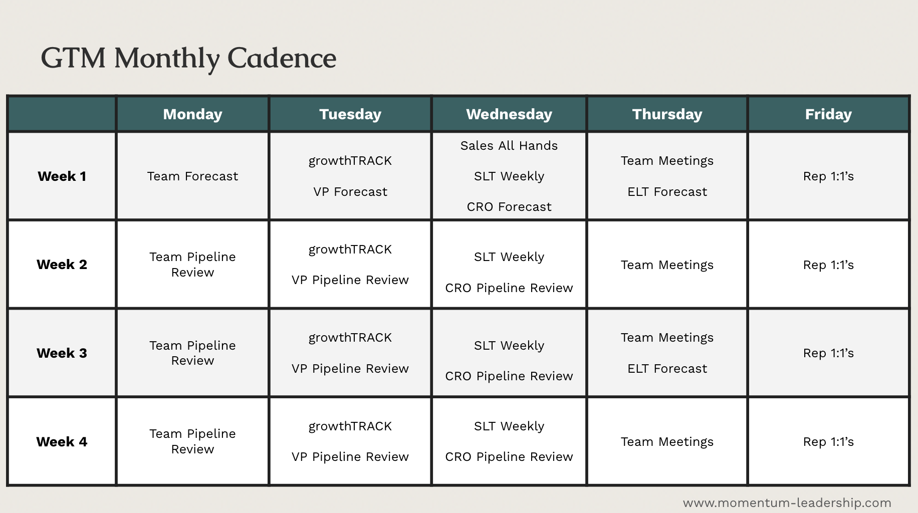 At Momentum, we help CROs zero in on the most essential levers for growth. Our GTM program helps you identify the hidden inefficiencies in your time and structure, turning a common scaling evolution into a developed skillset that pushes you past major revenue milestones. If your organization feels like it’s rowing in different directions, it is time to stop the spin and start scaling. Below you’ll find a link to our complete Operating Rhythm Framework to put immediately into practice for your sales team.